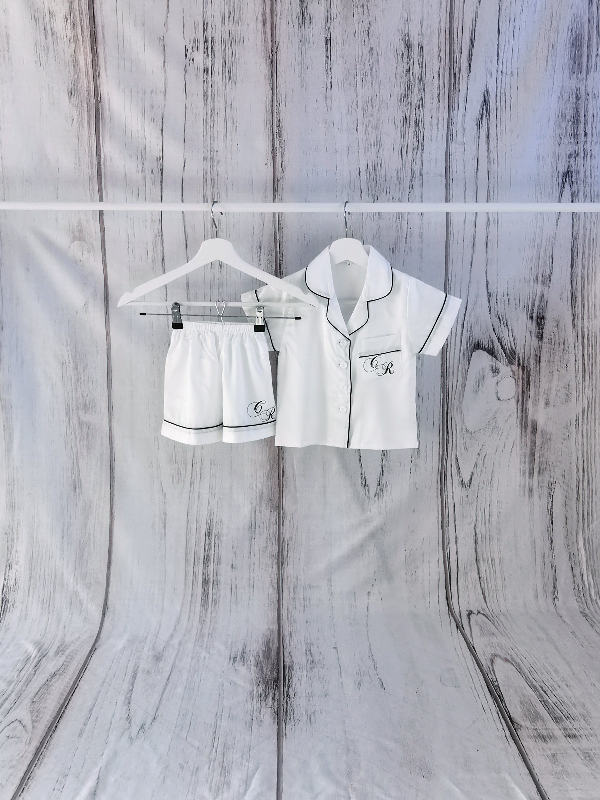 • Pyjama Sets: Includes a button-up shirt with elasticated waist shorts/trousers, personalized with your chosen text.