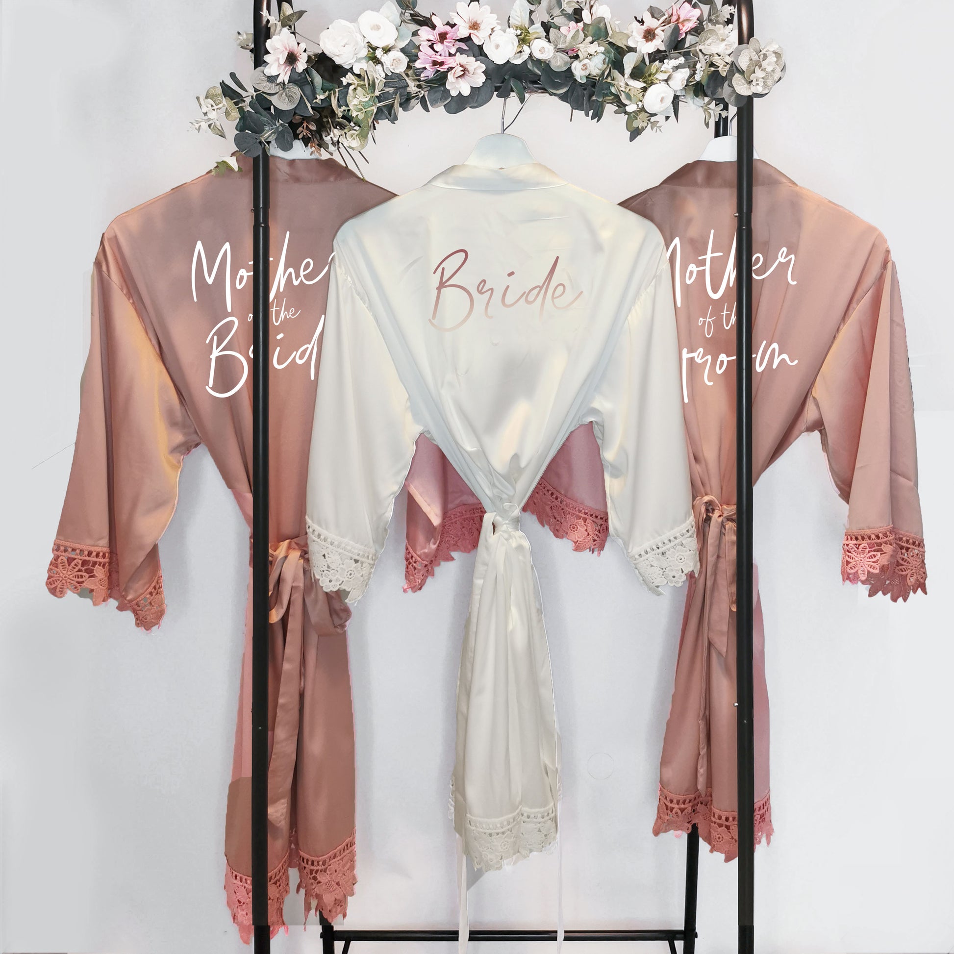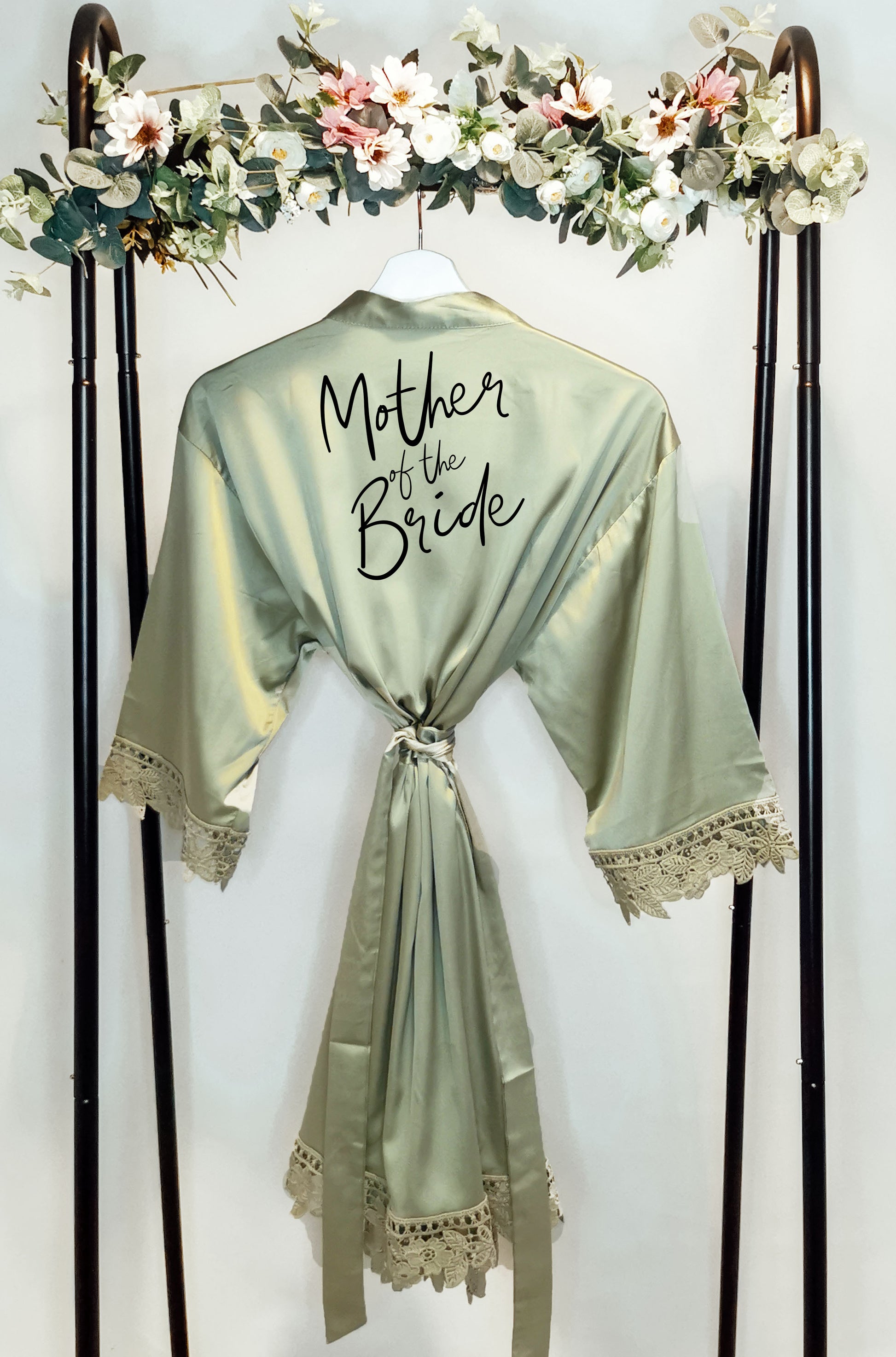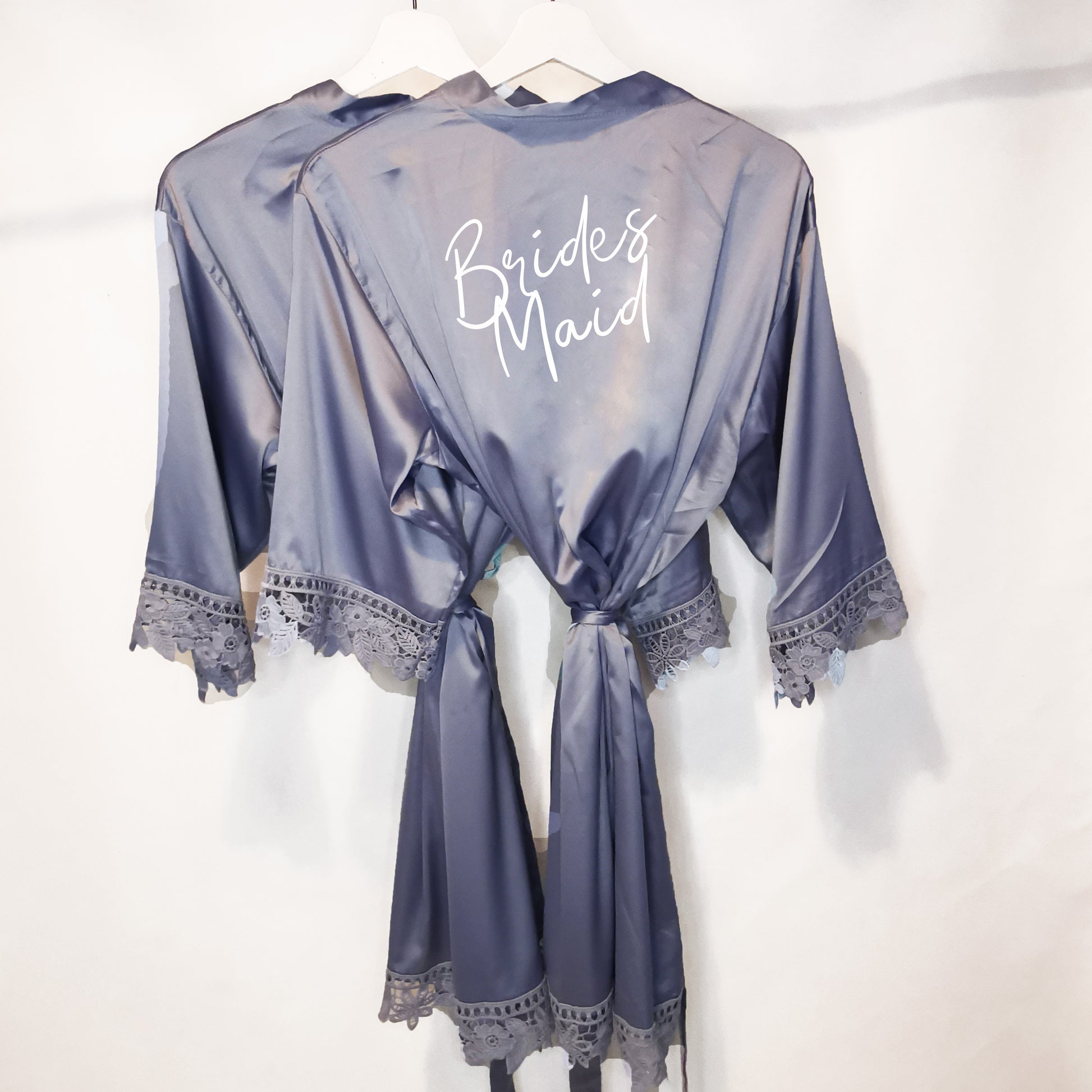 Featuring delicate lace trim for a touch of sophistication, this robe is customised with your name in a chic script font, making it a truly unique and special piece. Whether you're getting ready for a big day, unwinding in style, or gifting a loved one, this robe is the perfect choice for brides, bridesmaids, birthdays, and Christmas.
