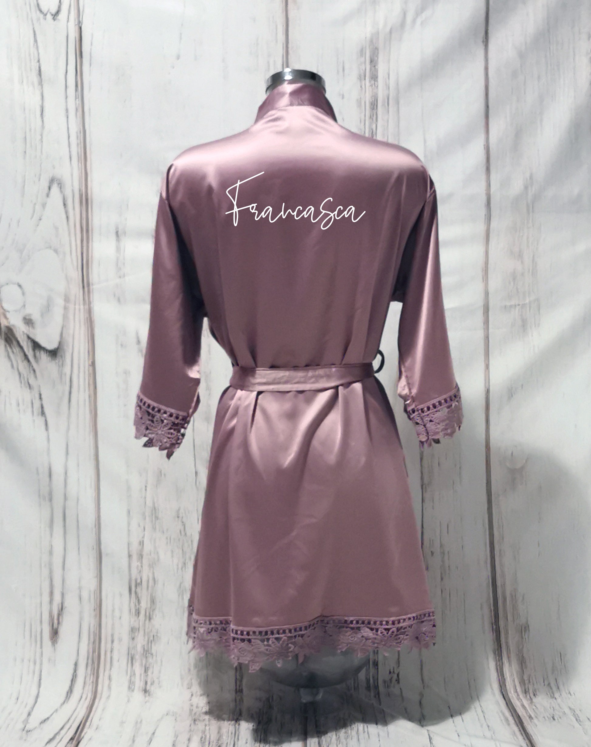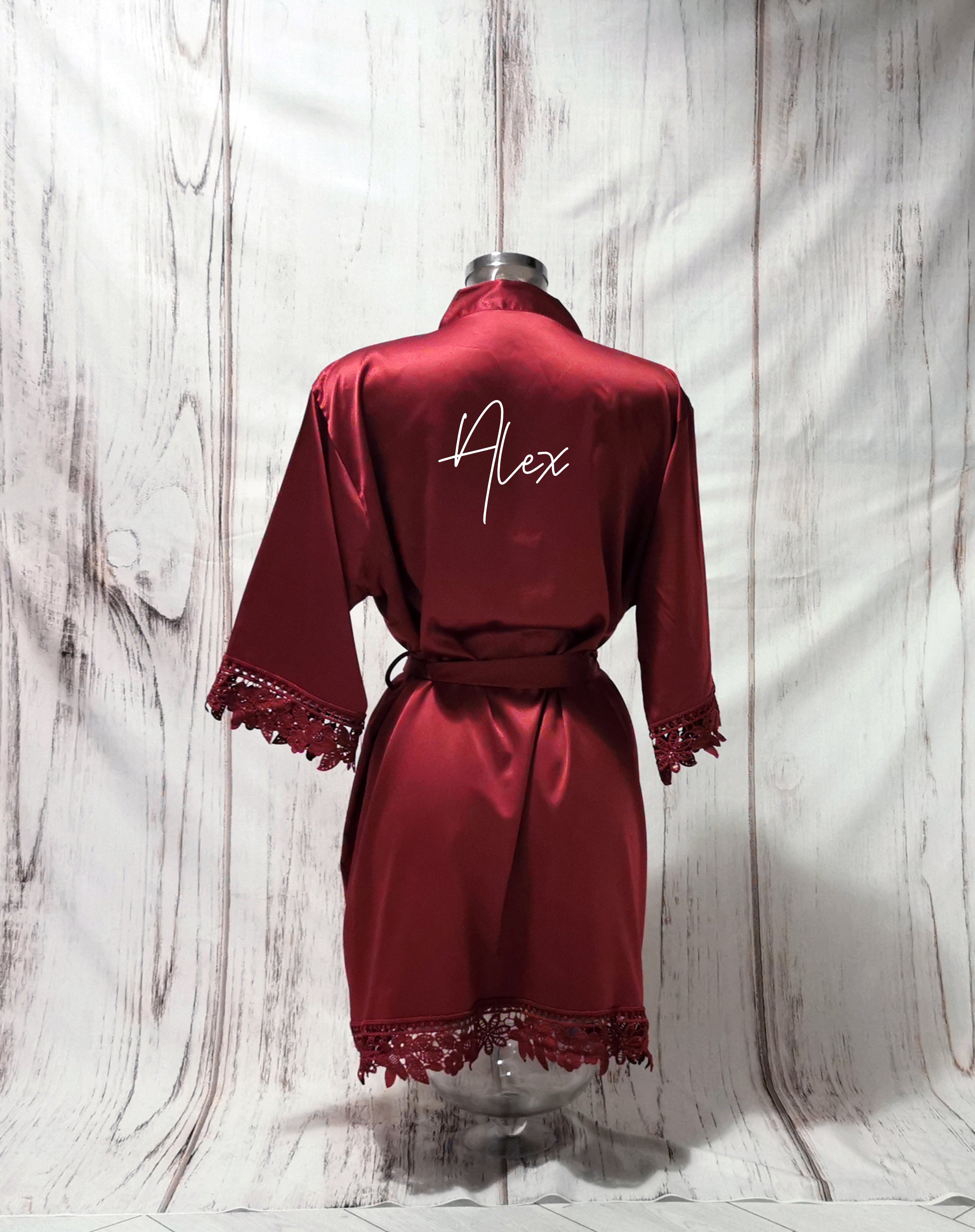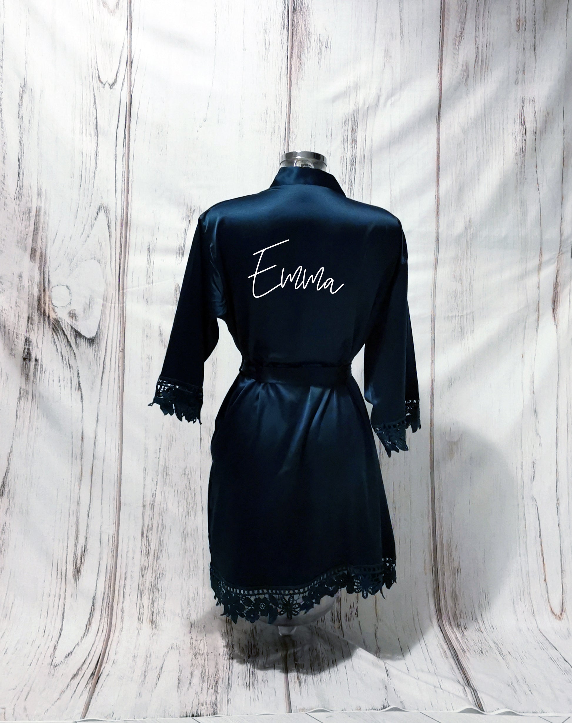 Featuring delicate lace trim for a touch of sophistication, this robe is customised with your name in a chic script font, making it a truly unique and special piece. Whether you're getting ready for a big day, unwinding in style, or gifting a loved one, this robe is the perfect choice for brides, bridesmaids, birthdays, and Christmas.