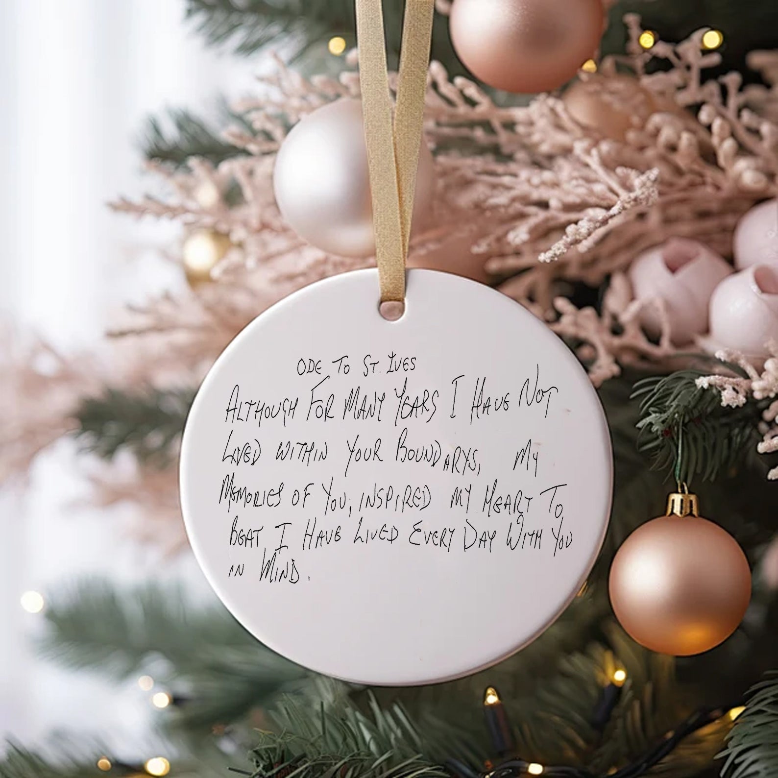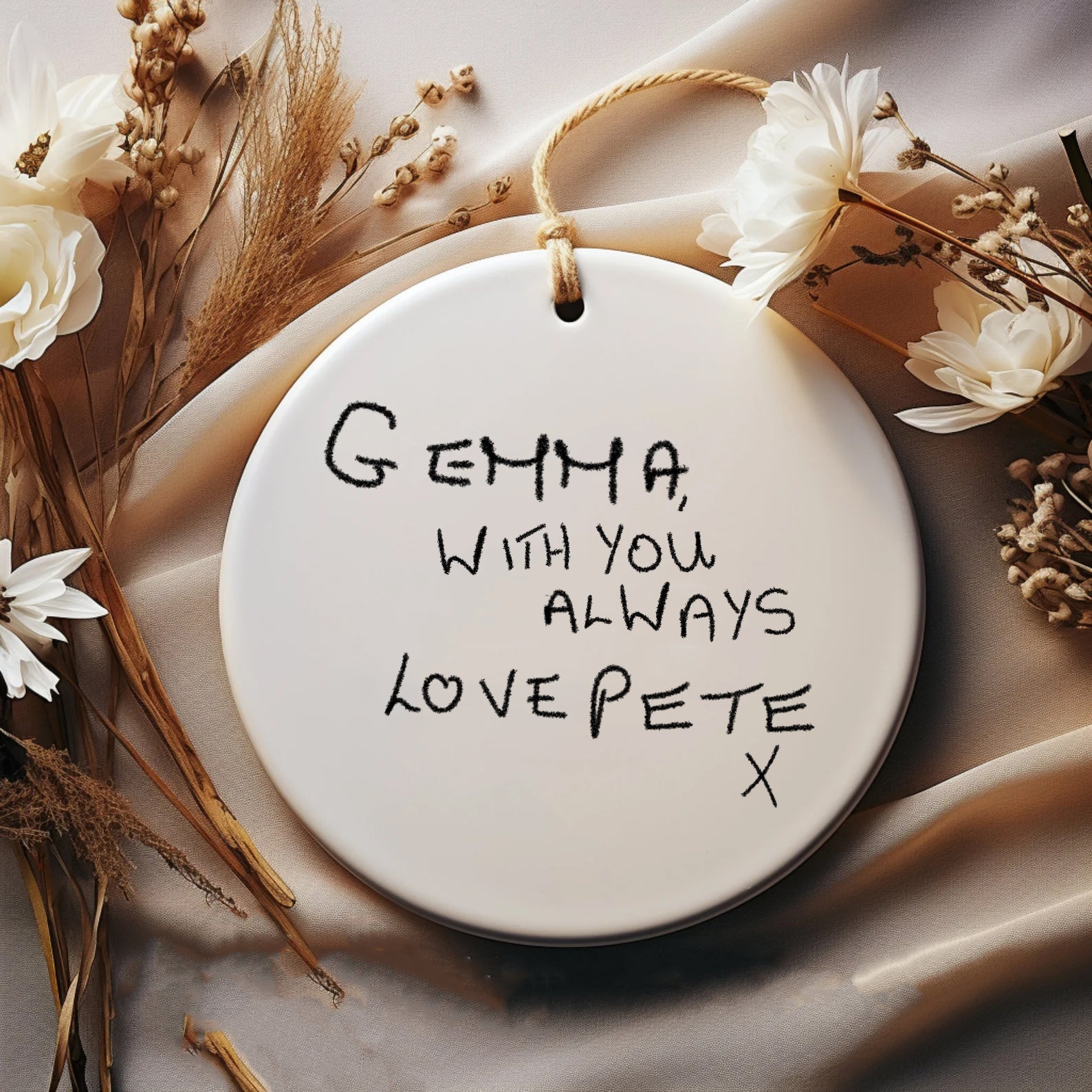 Cherish the memory of a loved one with our Personalized Handwriting Baubles. Each bauble is crafted from either ceramic or acrylic and features the genuine handwriting of someone dear to you. Using a photo of a handwritten note, we trace the unique lettering and transfer it onto a beautiful, lasting ornament. From greeting cards to shopping lists, any note with a variety of letters can be used to create a heartfelt keepsake that captures the warmth of your loved one’s words. This ornament is perfect for honoring those who cannot be with us, making it a beautiful memorial gift to hold close year after year.