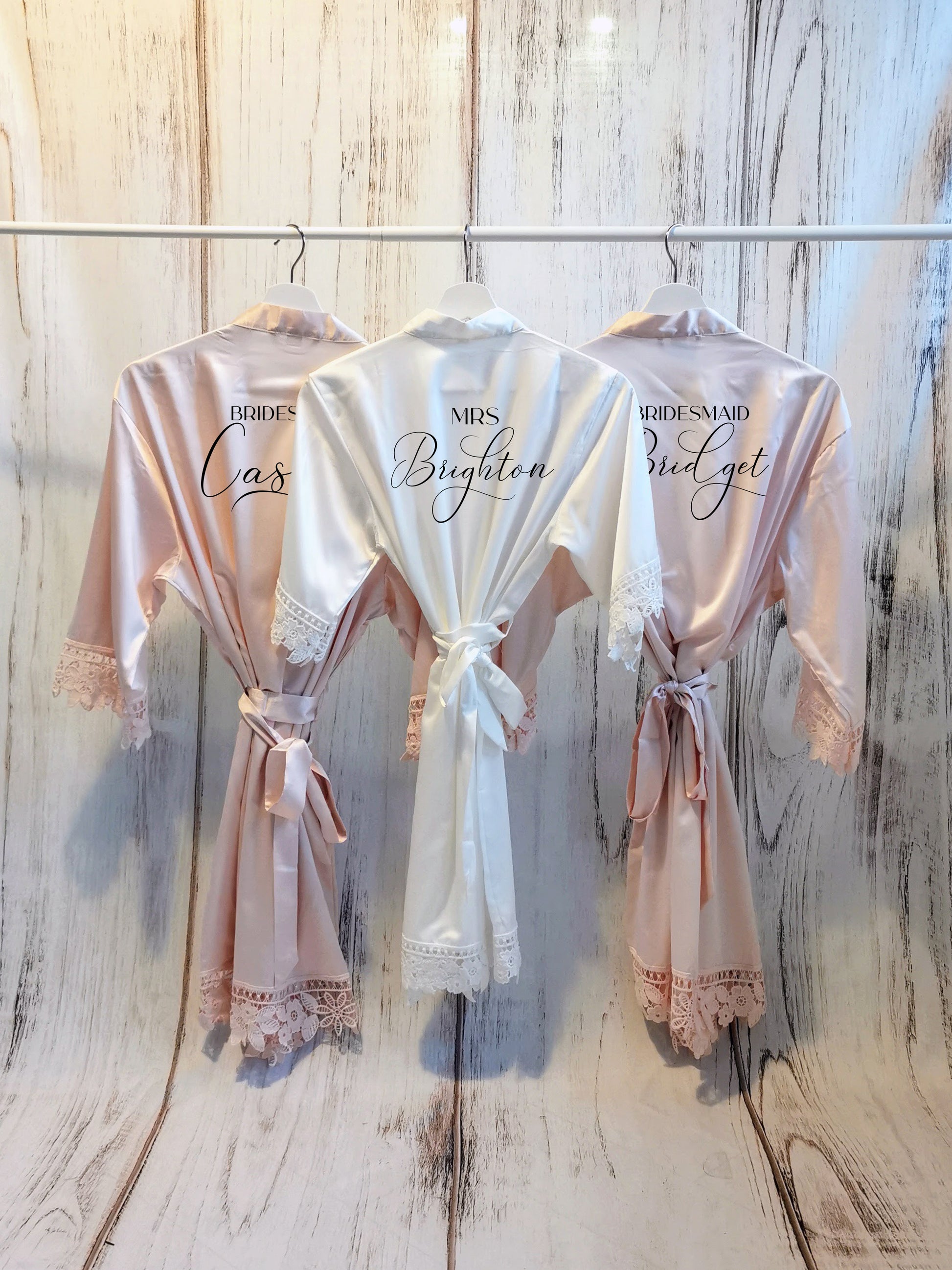 Featuring delicate lace trim for a touch of sophistication, this robe is customised with your name in a chic script font, making it a truly unique and special piece. Whether you're getting ready for a big day, unwinding in style, or gifting a loved one, this robe is the perfect choice for brides, bridesmaids, birthdays, and Christmas.