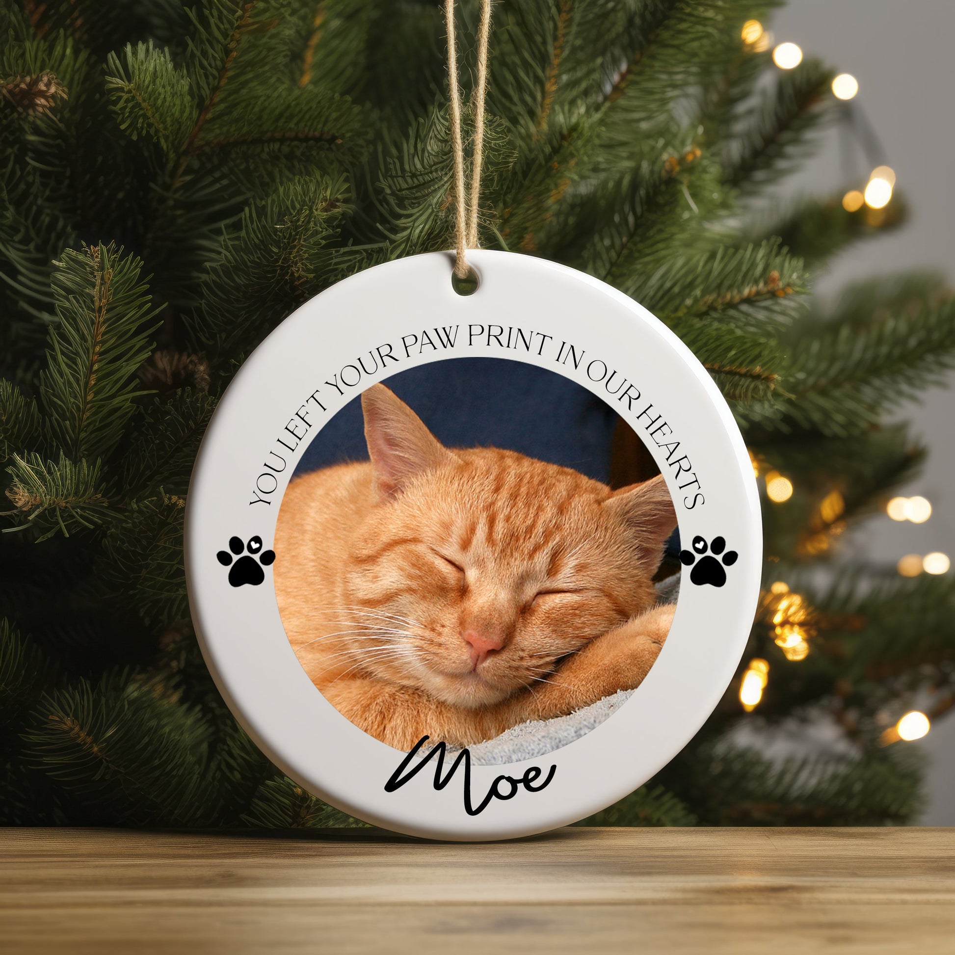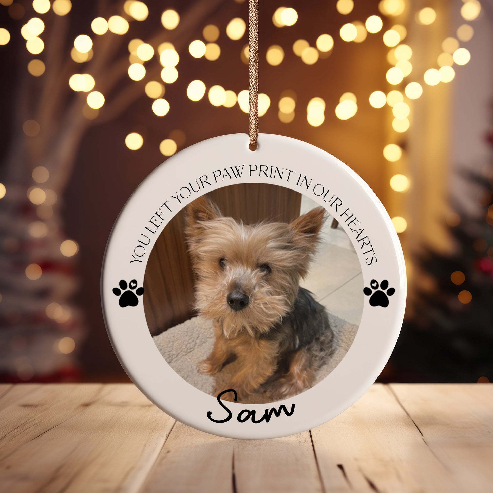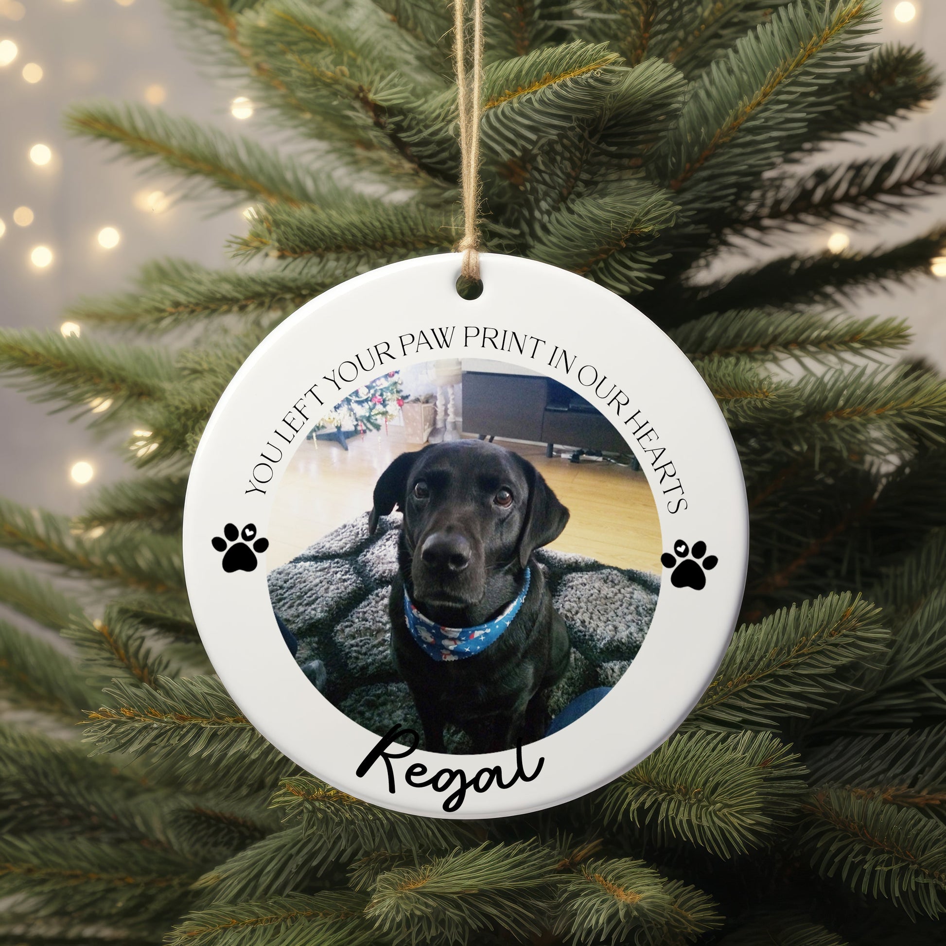 Order your "You Left a Paw Print on Our Heart" Photo Christmas Ornament today and cherish your pet's memory forever.