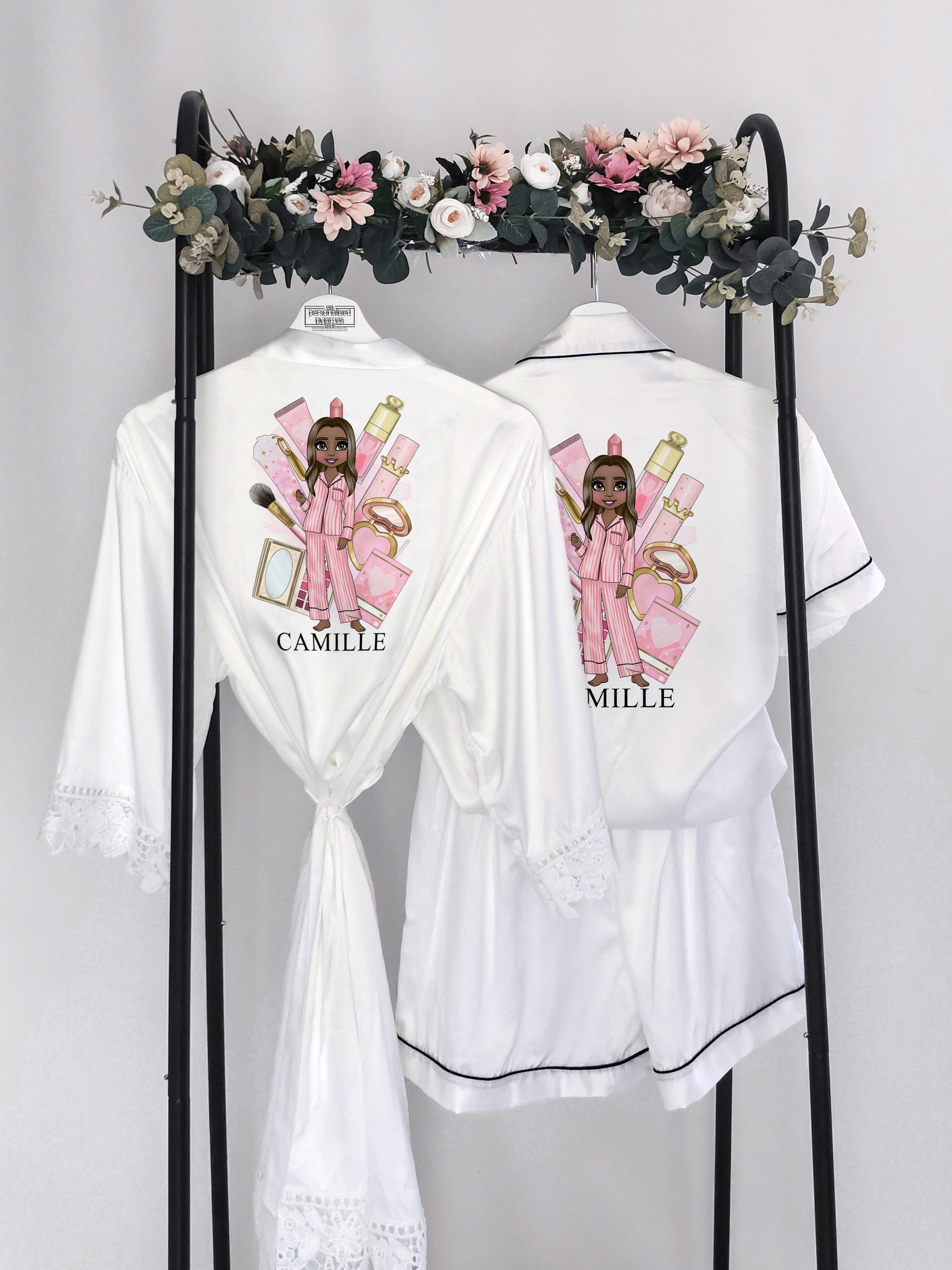 Crafted from premium satin fabric, these pyjamas are soft to the touch, providing ultimate comfort for lounging or a stylish sleepover. Each set is fully customisable with hand-drawn artwork and personalised initials, making them a truly unique gift for someone special – or a treat for yourself!