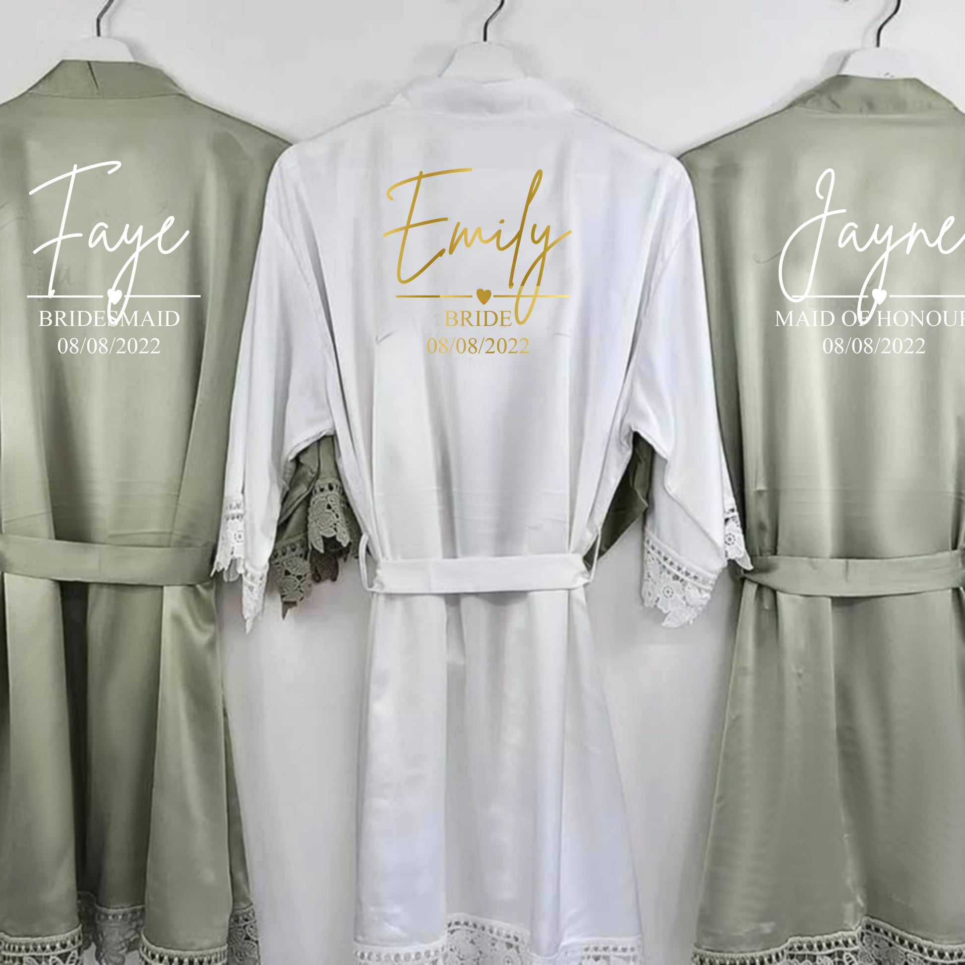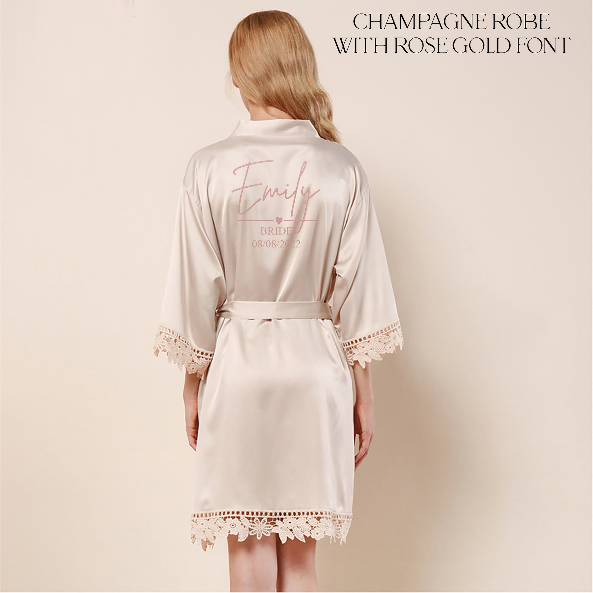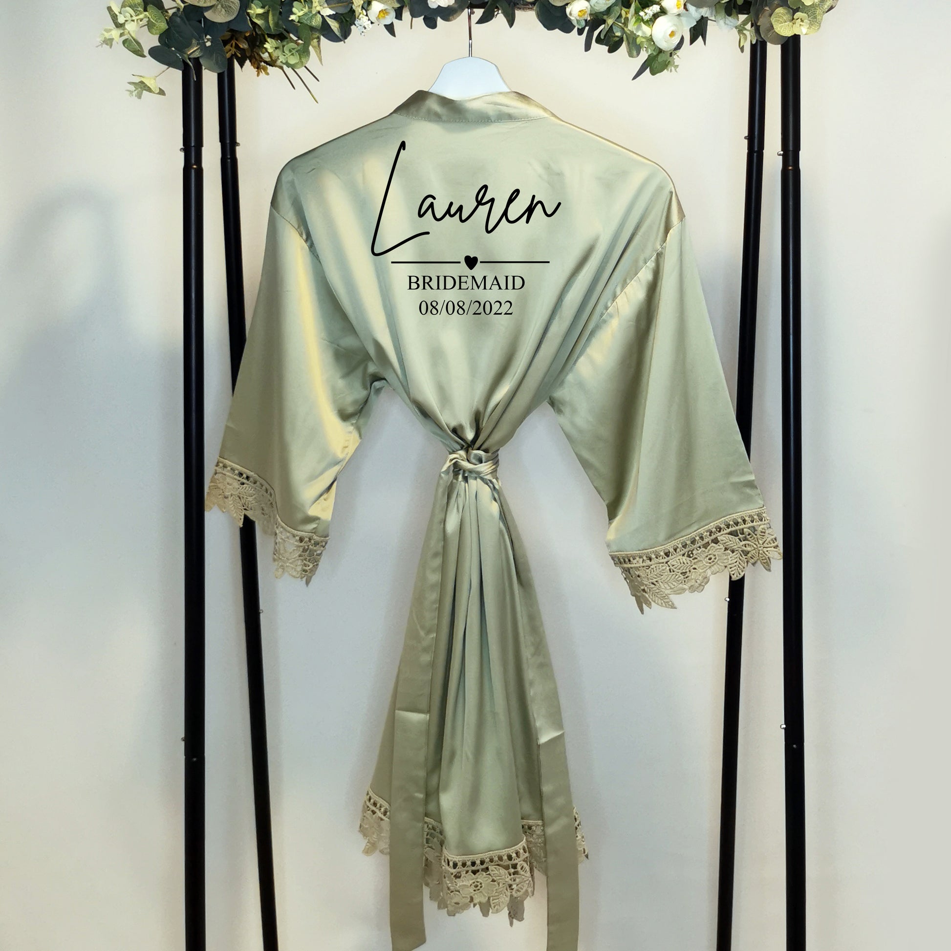 Featuring delicate lace trim for a touch of sophistication, this robe is customised with your name in a chic script font, making it a truly unique and special piece. Whether you're getting ready for a big day, unwinding in style, or gifting a loved one, this robe is the perfect choice for brides, bridesmaids, birthdays, and Christmas.