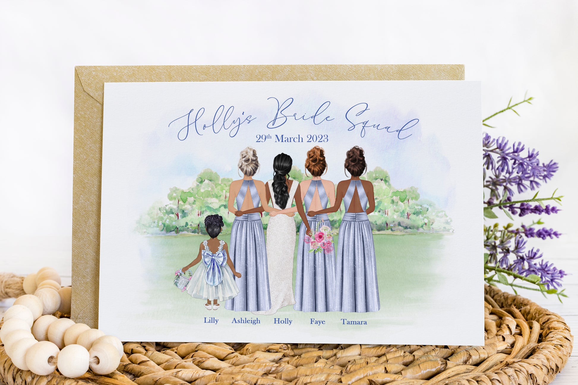 Discover one-of-a-kind wedding prints that are as unique as your bestfriends. Our personalised prints are hand drawn and made to order in Hull, Yorkshire with your over 100 dresses and 200 hairstyles to choose from.