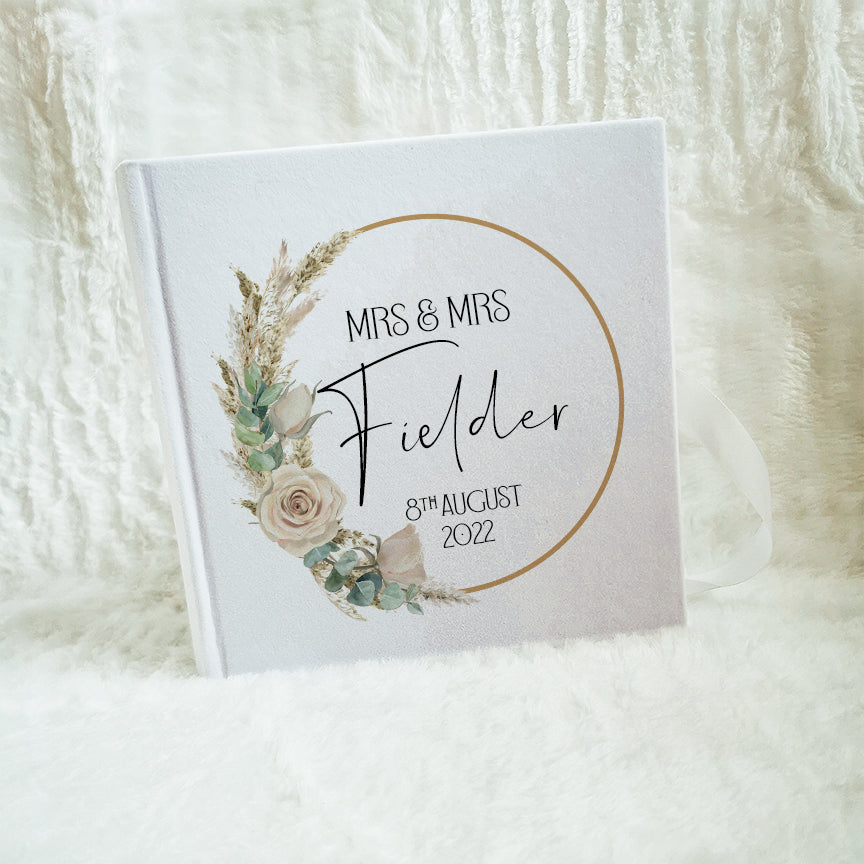 Personalised luxury white velvet guestbooks, make the perfect engagement present for the happy couple to be or the perfect addition to your wedding day. Each book comes with a white satin ribbon, allowing you to tie your perfect memories and well wishes away safely.